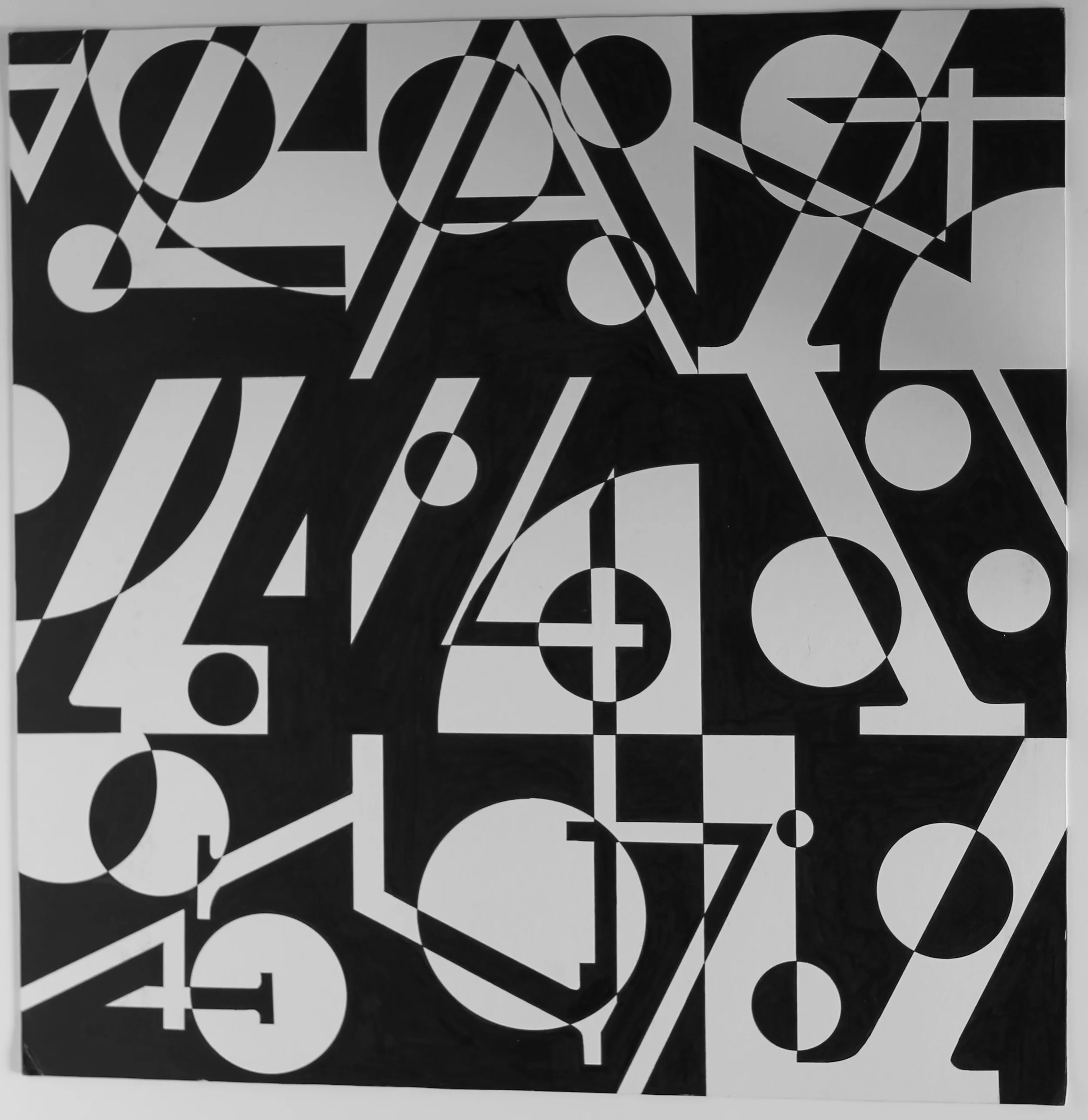 This composition was created by combining nine individual compositions all of which utilized the same underlying grid while incorporating the letter A, the number 4 and a circle. This work was done by hand using pen and ink.