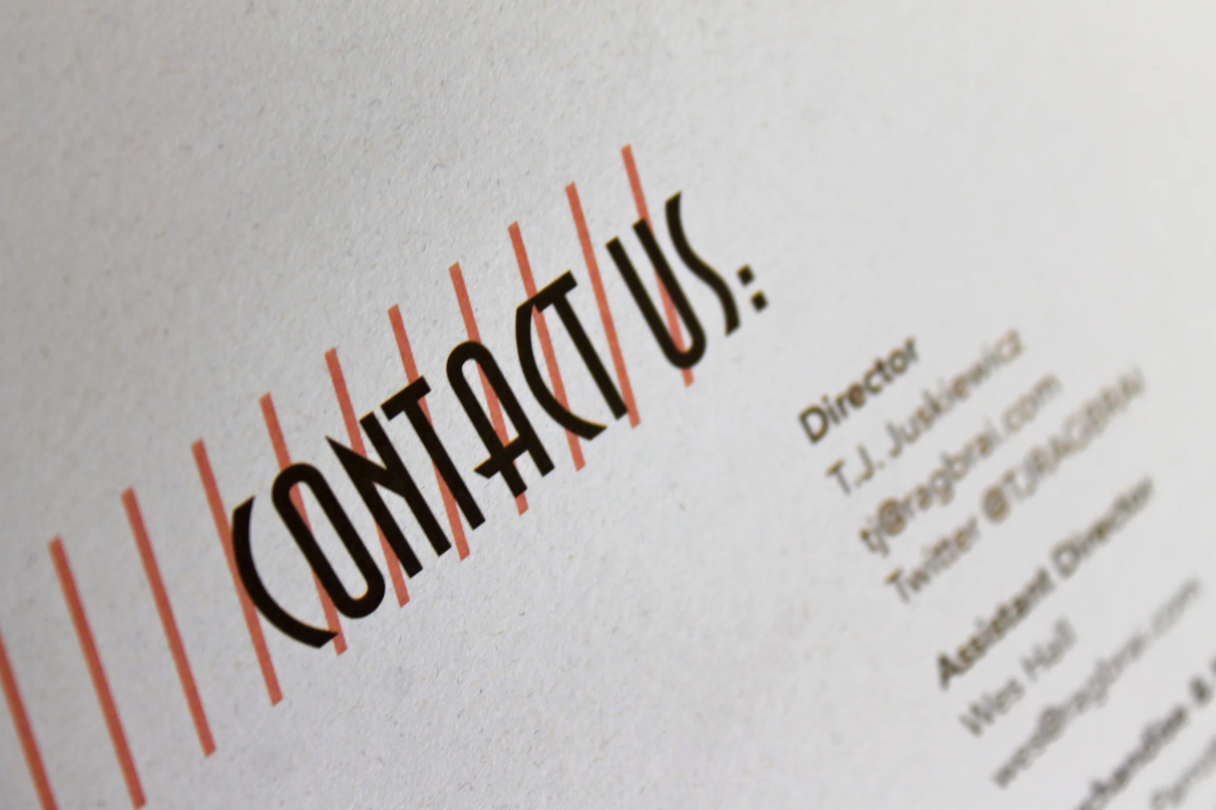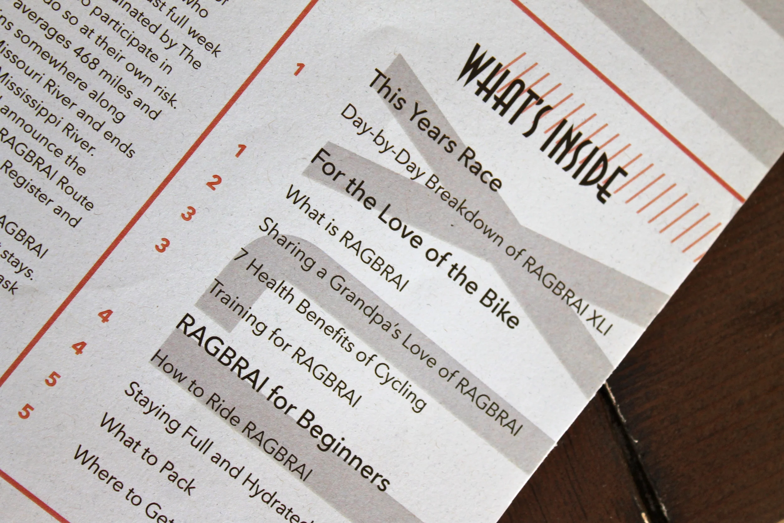 This newsletter promotes RAGBRAI, an annual non-competitive bike ride that travels across the state of Iowa. It was created using only two colors, Pantone 486 C and Pantone 476 C.
